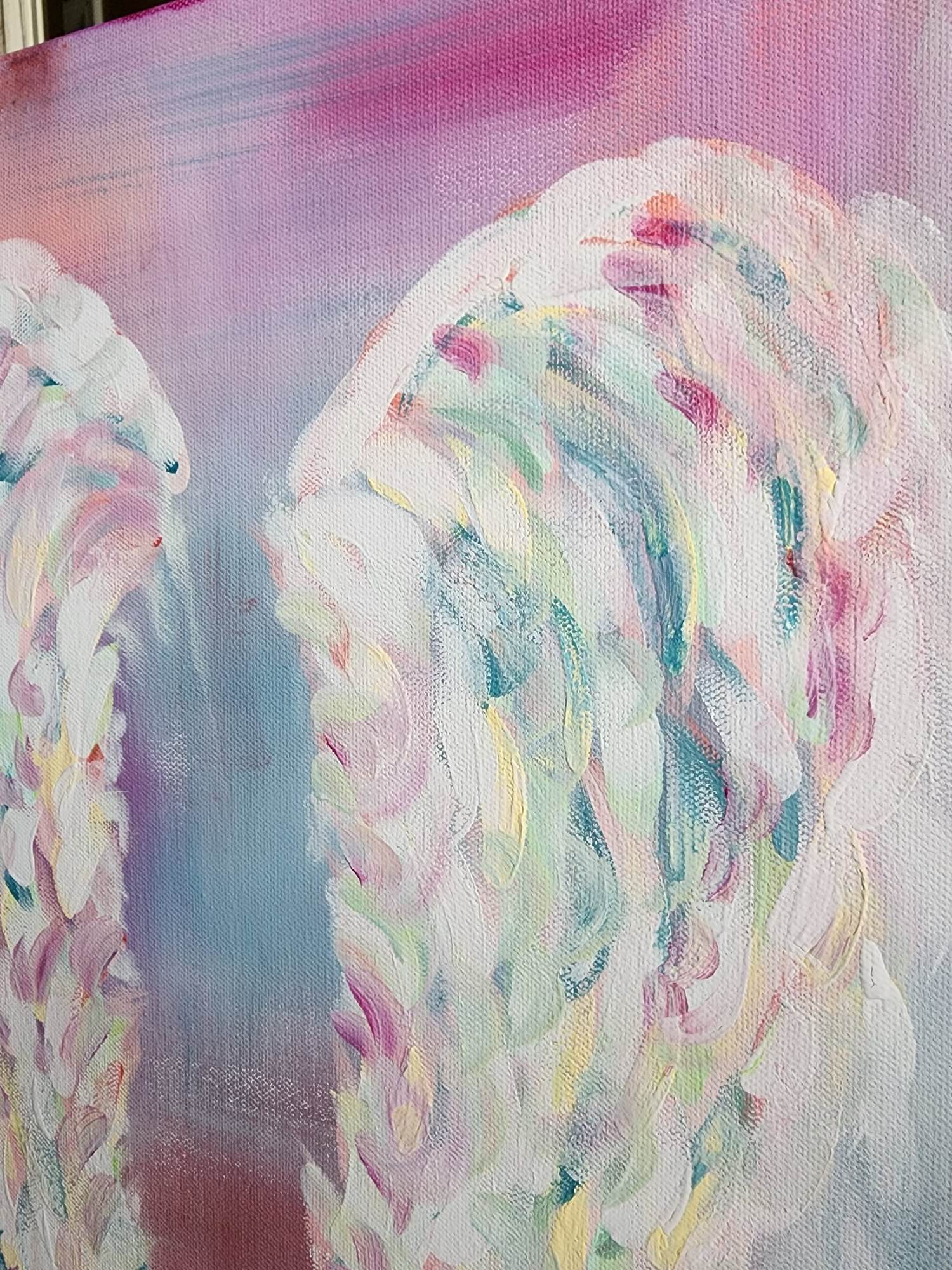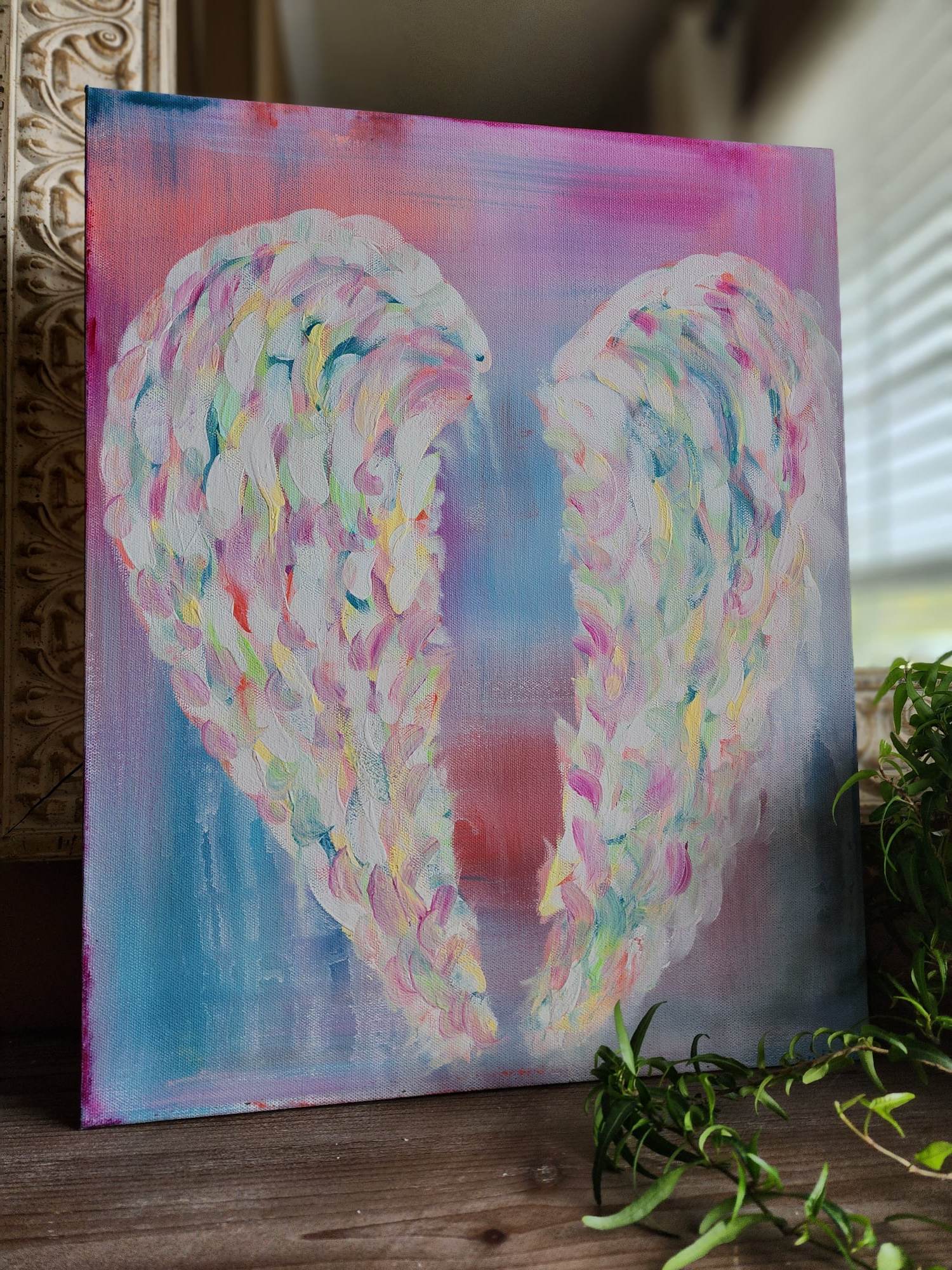 With this piece, I was nervous at first to try my hand at angel wings. I've seen so many and really wanted to capture the essence of joy and love with the colors and movement of the wings. As I was creating this piece, with guidance, I thought about sweet children, so innocent and peaceful. Those that lost life too early. A reminder of someone's loved one, being there for them. These are gentle and joyful reminder of their beautiful moments together.