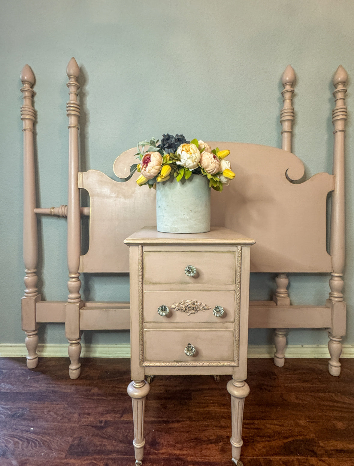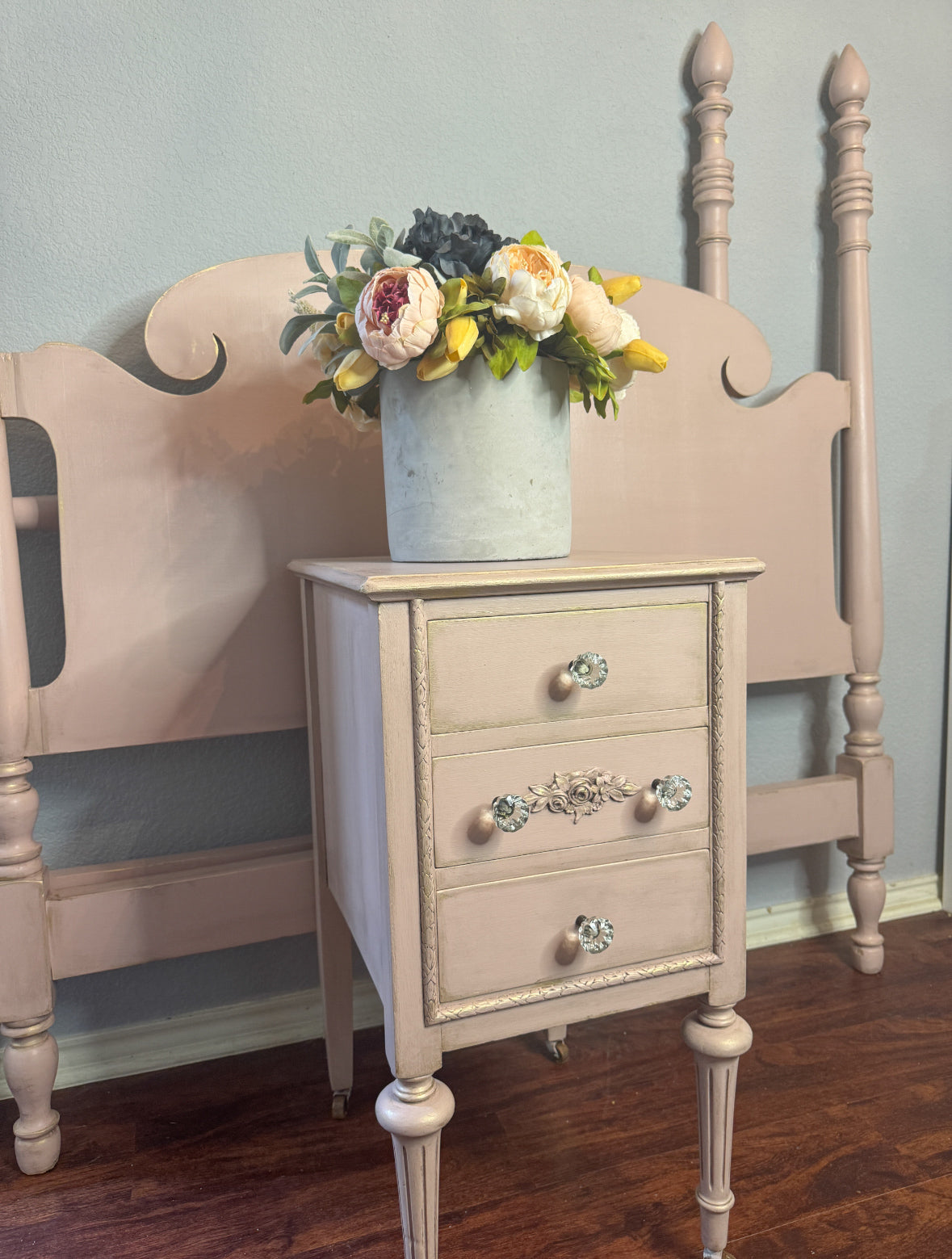 Welcome this one-of-a-kind vintage full size bedframe and night stand.
