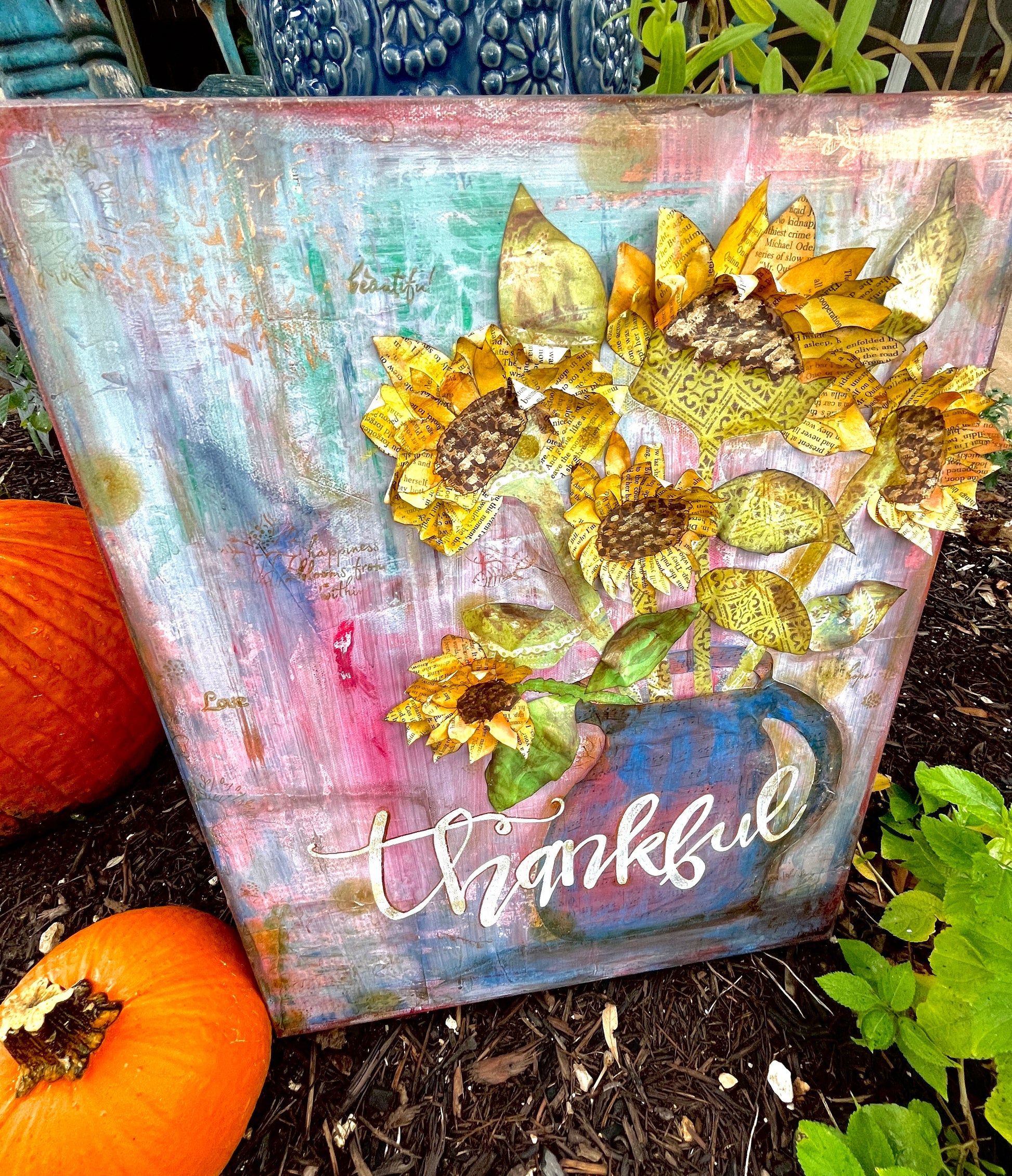 I’ve created a 3D bouquet of sunflowers coming out of a weathered and antiqued vase. This mixed media piece has layers of texture and color. It is adorned with copper highlights and a message of thankfulness.