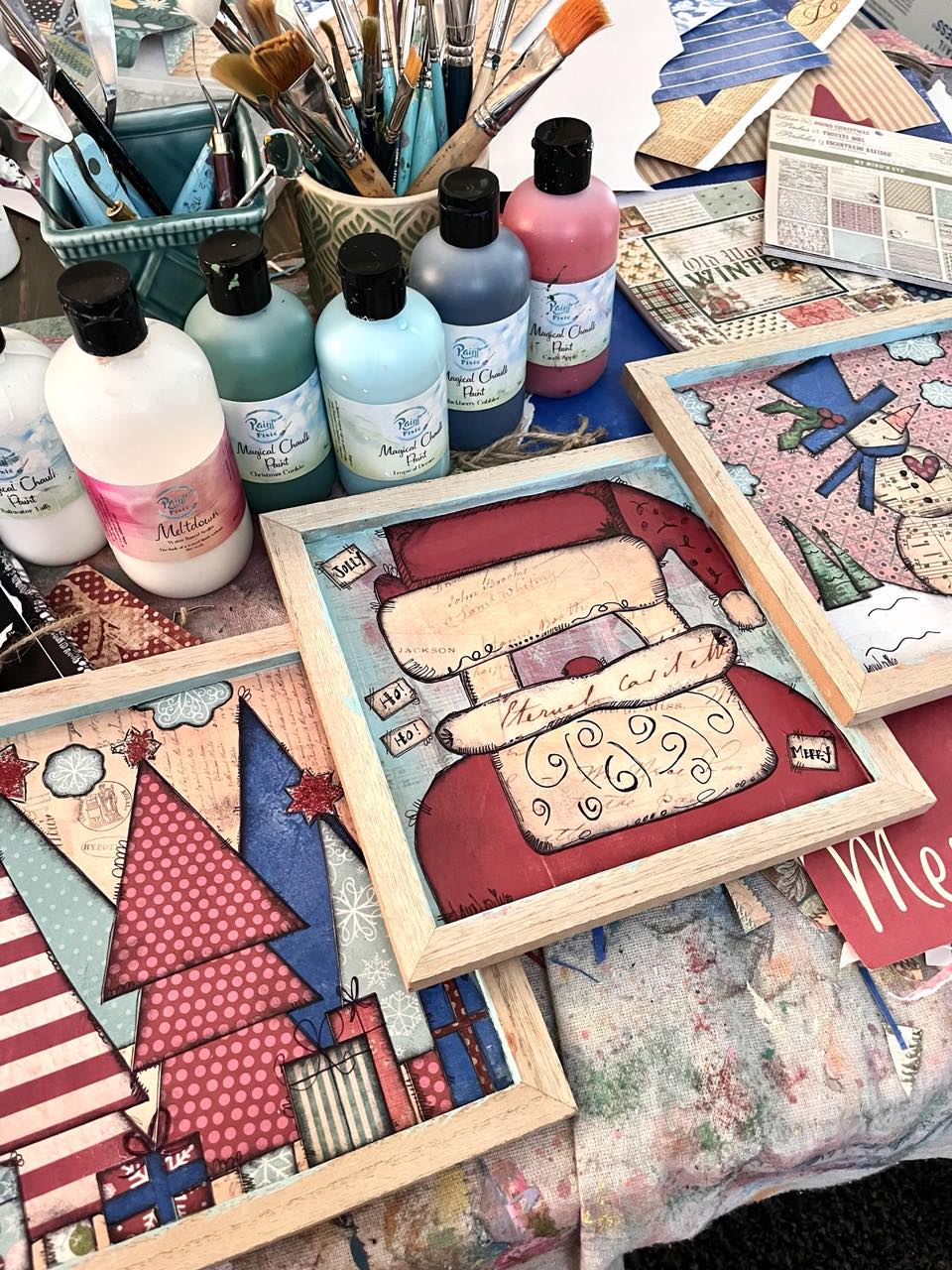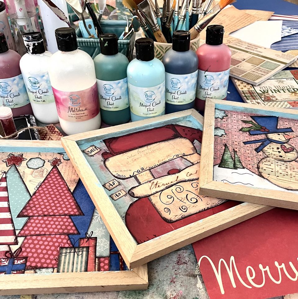 This cheerful, upcycled Christmas Decor will bring a merry merriment to your holiday season! Adorned with three nostalgic designs of Santa, Christmas trees and a jolly snowman, this vibrant and bright mixed media decor will spark joy. Show your festive spirit with this merry set--a true treasure for your home or sweet holiday gift!